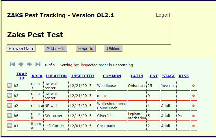 Zpest Tracker is a tool built using the guidelines of the Integrated Pest Management Working Group, https://museumpests.net, recommendations that you use to log and organize your pest observations. It has various built in reports that you can use to evaluate the effectiveness of your pest management program.